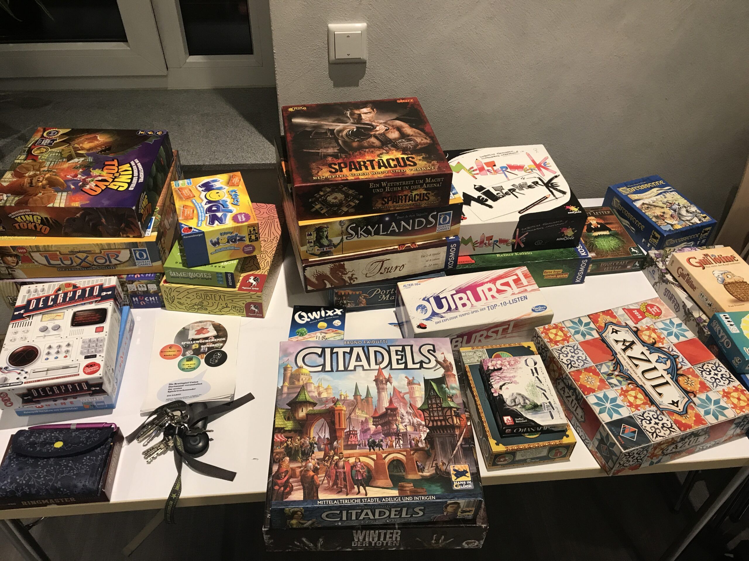 Ach ja, und gespielt wurde auch ne Menge. Spielend für Toleranz, bunt und abwechslungsreich, herausfordernd, leicht zu gänzlich, anspruchsvoll, kindgerecht, geschicklichkeitsanstrengend, albern, konzentriert, familientauglich, farbenfroh und rudimentär. Die Spieleauswahl war riesig. Stramme 7 Meter Lang war die Spieleauswahl ausgebreitet. Für alle war etwas dabei. So wurden Kinderspiele wie Geister, Geister, Schatzsuchmeister, Funkelschatz, Zicke Zacke Hühnerkacke, ICECOOL und viele weitere Spiele gespielt. Der Familiensektor war sehr groß bedient und vertreten: Drop It, Exit Das Spiel, Klack, Gizmos, Azul und viele weitere Spiele fanden auf den Tischen Platz. Auch herausfordernde Spiele wie Istanbul, Ruchlos, Die Tavernen im tiefen Thal, Onitama, Imperial Settlers und viele weitere wurden auch gespielt. Für alle war mindestens ein, zwei, wenn nicht sogar drei Spiele dabei. Ein wahrlich großes und vielseitiges Angebot.