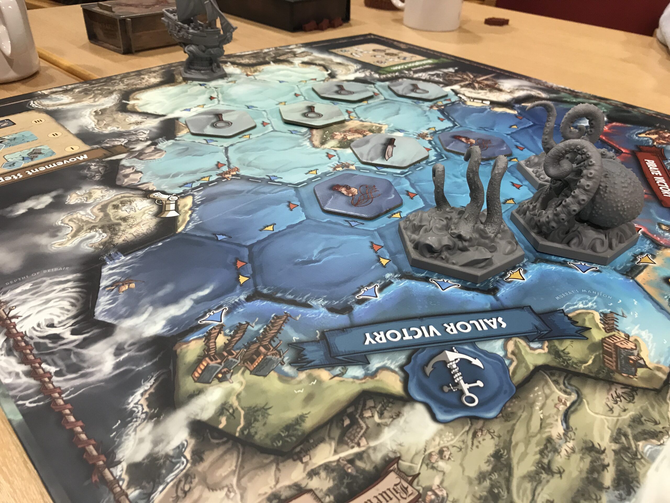 Dafür wurde es aber sehr verspielt zum Abend hin noch. Sei es in komplexer Art und Weise, oder gemütlich und zugänglich. In On Mars wurde selbiger besiedelt. Anschuldigungen und dem Wahnsinn entrinnen wollend ging es spannend bei Betrayal at House on the Hill her. Süße Tierchen tummelten sich bei Everdell, Rajas of the Ganges hatte nicht nur schöne Würfel in der Schachtel, in Pirates sammelten wir Karten und schipperten via Wettrennen auf dem Wasser, Tag und Nacht in Solennia, in First Rat wurde eine Rakete gebaut, und und und … Viele bunte und schöne Spiele füllten die Tische, und bei so manchen kamen große Kraken und Dinosaurier ans Tageslicht, wie zum Beispiel bei Feed the Kraken und Dinosaur Island.