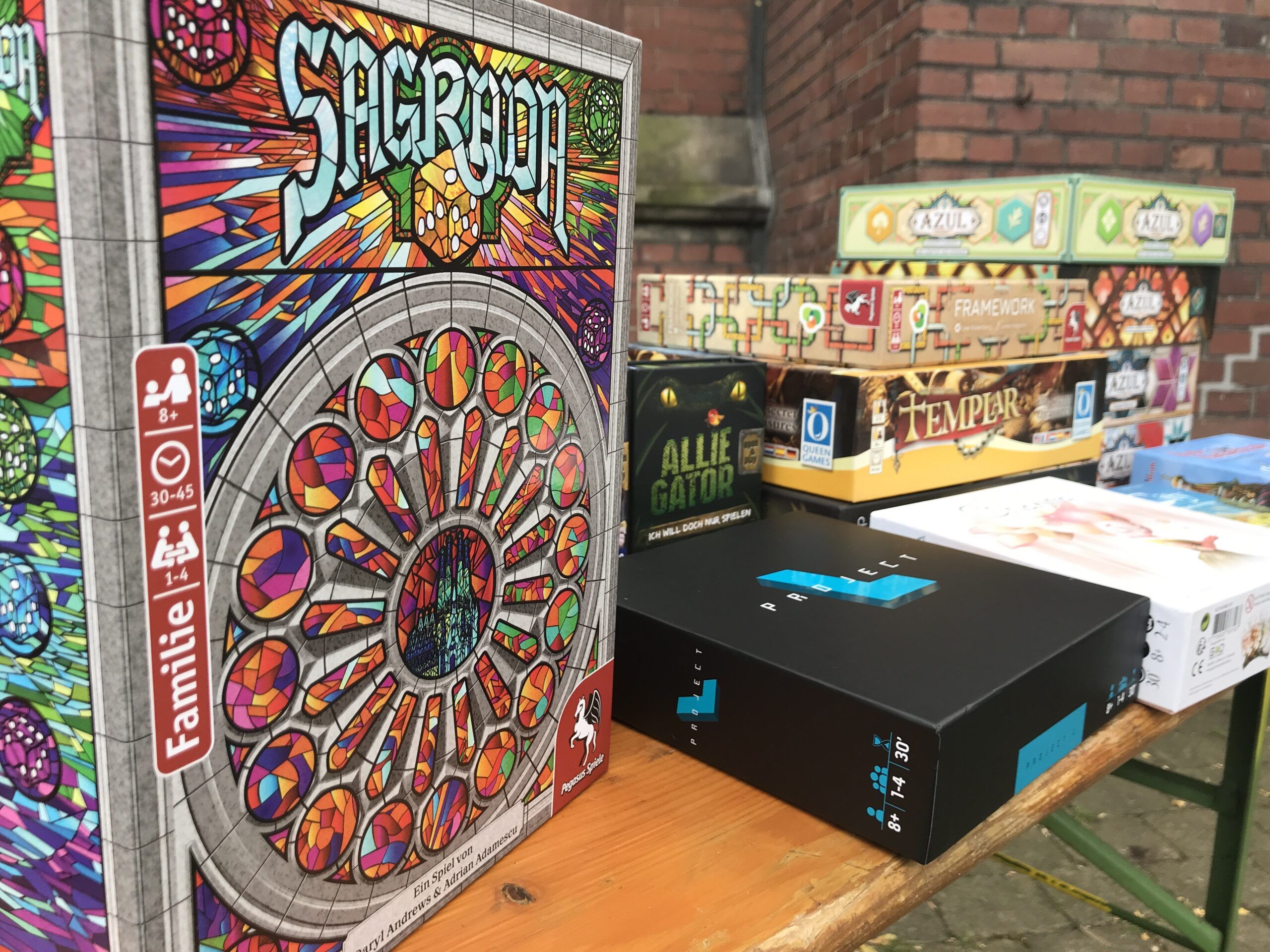 Auch wenn die Überschrift des Beitrags lautet, dass das „UZWEI-Spielen“ in der Pauluskirche stattgefunden hat, so waren wir doch eher vor der Kirche neben dem Seitenschiff, um bei wunderbaren Wetter in einem überdachten Hof zu spielen. Und ganz passend zum Anlass, so nah an der Kirche zu sein, war das Spiel Sagrada im Fokus. An mehreren Tischen wurden Kirchenfenster gebildet, die durch Würfel symbolisiert wurden. Aber Achtung: Keine kleinen Farben und keine gleichen Zahlen nebeneinander. Das kann schon eine Herausforderung sein.
