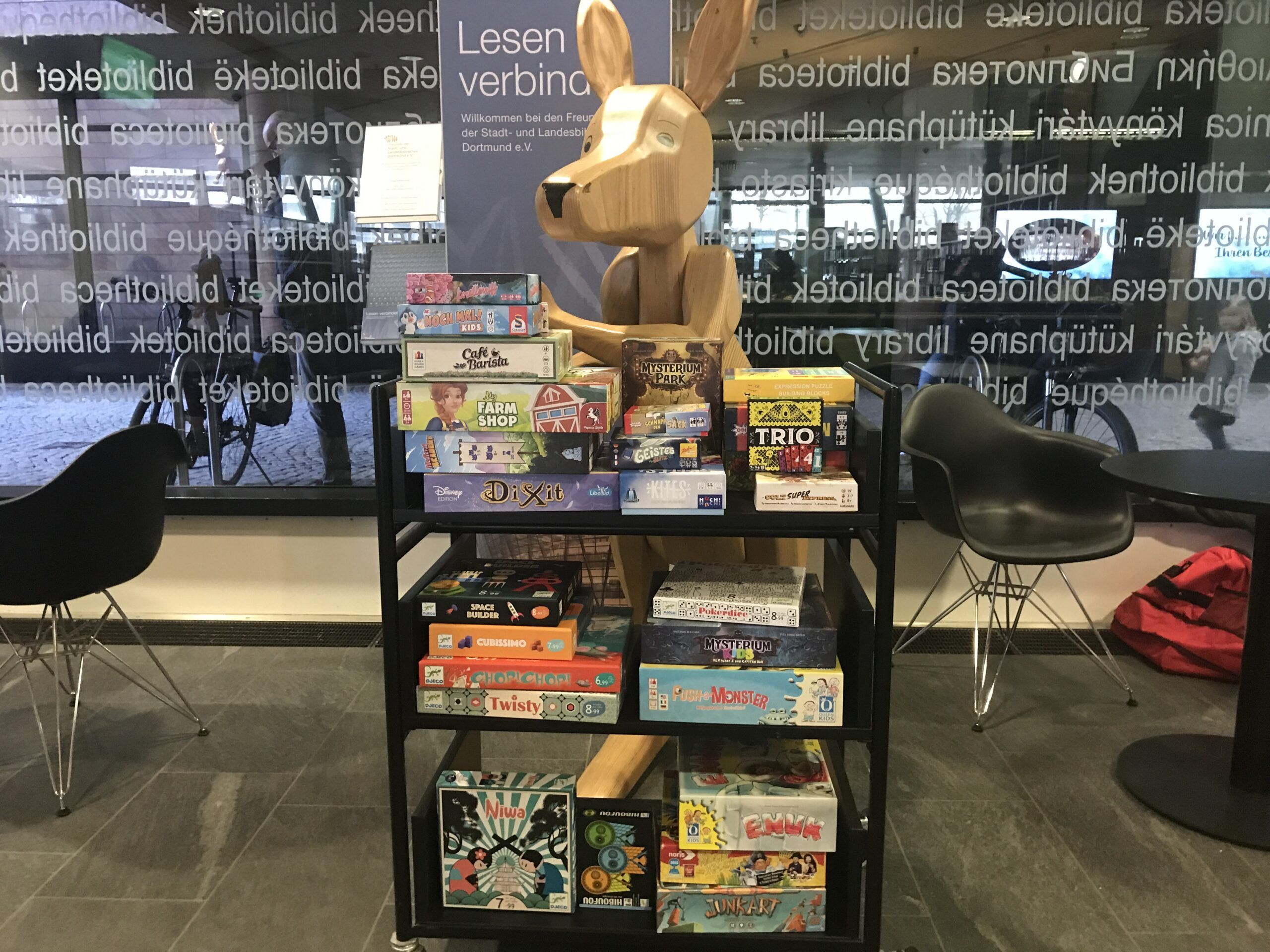 Seit über einem Jahr besteht die Kooperation mit der Stadt- und Landesbibliothek in Dortmund. Seit über einem Jahr bringen wir jeden 2. Montag am jeweils 2. Samstag Spaß und Freude ins Foyer. Und vor allem Spiele. Auch so am 10.02.2024. Und gekommen sind viele. So viele, dass wir noch Tische aus der 1. Etage dazuholen mussten, um die Menschen an die Spieltische zu bringen.