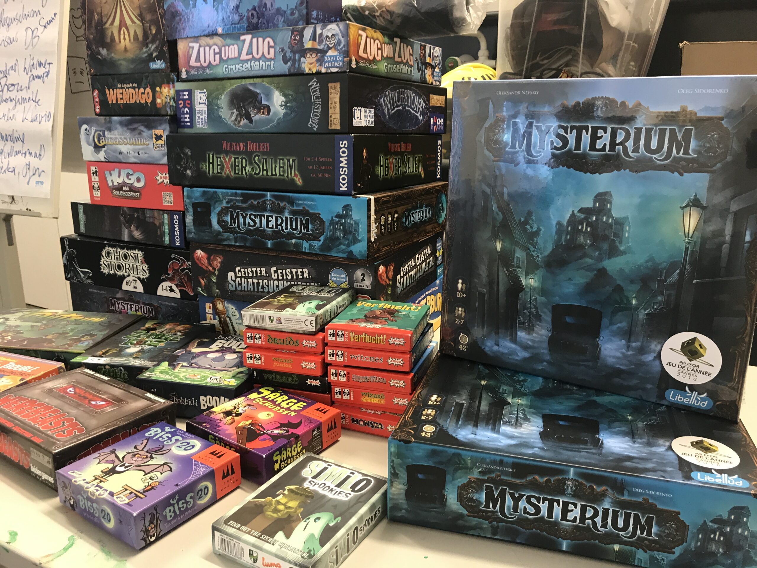 Besuchende konnten sich nicht nur an Mysterium versuchen, bei dem wir die Visionen eines Geistes deuten müssen, auch andere Spiele kamen auf den Tisch. Mysterium Park, Mysterium Kids machten zum Beispiel die Trilogie komplett. Aber auch andere Spiele wie Monster unter dem Bett, Similo Halloween, Dreadful Meadows, Monster Slaughter, Zug um Zug Gruselfahrt, Hugo, Hexenflug, und viele weitere Spiele kamen auf die Tische.